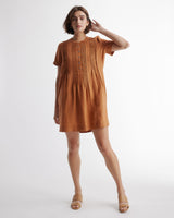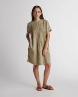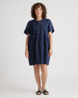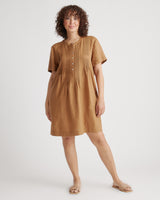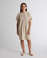 Short-sleeved, relaxed style. Super versatile and easy to wear. Featuring pin-tucking up top, shell buttons, and pleat detailing. Our linen collection is made from 100% European flax linen—an eco-friendly, and resource-light material.