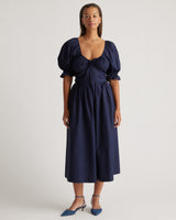 Try on a striking new silhouette in our 100% Organic Cotton Puff Sleeve Midi Dress. Crafted from premium organic cotton poplin, this dress has a cool, crisp structure yet feels lightweight and fluid. The adjustable tie neckline and smocked back detail allow you to customize the fit, while the puff sleeves and low-cut neckline play up the drama. It's practical too, with pockets for that added bit of functionality. Chic, comfy, and convenient—now that's a combination we can get behind.