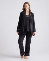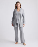 Soft and silky to the touch, this three piece pajama set is luxe without compromising comfort. Designed with nursing in mind, the tank includes a built-in bra and clip-down straps for easy feeding. The pants have an elastic waistband and functional drawstring for an easy fit and the robe includes side pockets and a removable tie. Crafted in our premium rayon from bamboo, with just the right amount of stretch. This breathable and hypoallergenic fabric will keep you cool in the summer and warm in the winter without irritating your skin. A hospital bag must have!