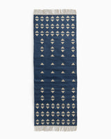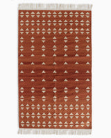 The Shay Wool Kilim Rug features a geometric pattern and is offered in both a rich blue and brick palette.