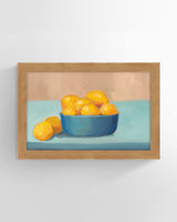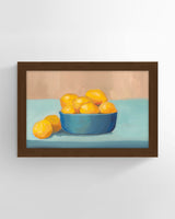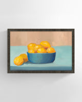 When artist Ryan Brown gives you a bowl of lemons, consider making a gallery art filled with still life. His bold, giclee print canvas—with soothing, saturated blue tones and a flat-mounted frame—is certainly a good start.