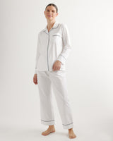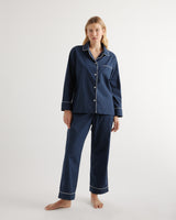 Sleep in style in crisp, cool cotton. This long sleeve shirt and straight leg pant combo has piping detail at the hems and elasticated pajama waistband.